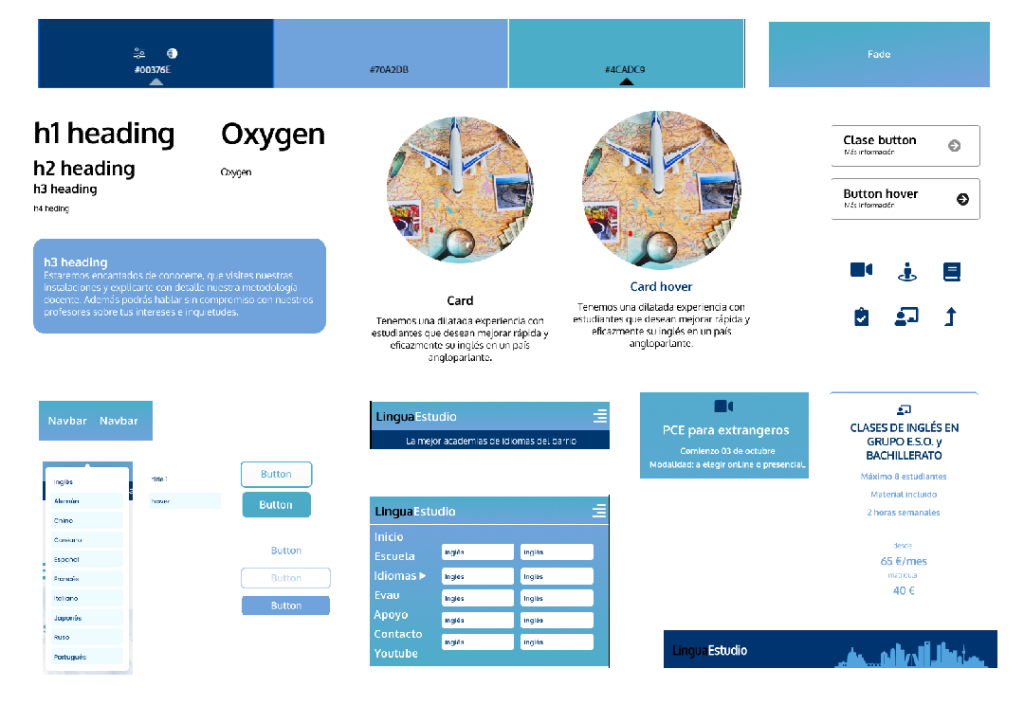 Para dar forma al sitio web de Lingua Estudio, se ha seguido una metodología de diseño conocida como Atomic Design, lo que ha requerido un total de 5 horas de trabajo para establecer una estructura sólida y coherente. Posteriormente, se han dedicado 2 horas al diseño de los wireframes, esbozando la disposición de los elementos clave de cada página.
